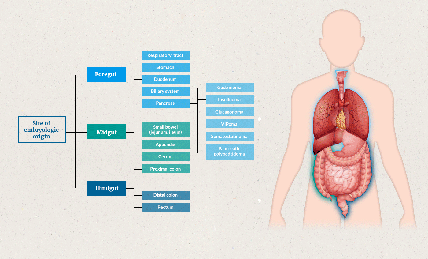The three main areas where NETs originate from in the body are the gastrointestinal tract (digestive system), the pancreas and the lungs.